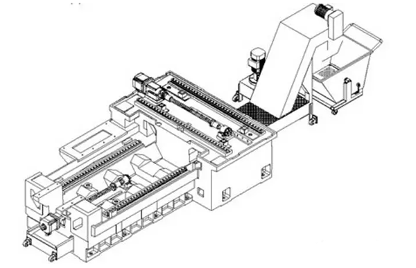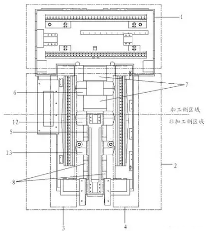 639cc全民彩 其包括:X轴底座、Z轴底座、Z轴导轨左支撑体、Z轴导轨右支撑体、桥式横撑、加工侧落屑通道、非加工侧落屑通道、全贯穿底座空腔、Z轴驱动、Z轴驱动安装体和链板排屑器。