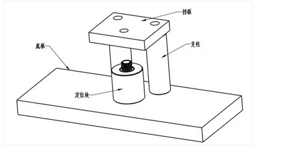 设计要点:上图为冲孔工装的常用结构。底板作用为方便固定在冲床的工作台;定位块作用为固定产品,具体结构按产品的实际情况而设计,中心点围绕能方便安全的取放产品;挡板作用在方便产品从冲刀上脱离;支柱起固定挡板的作用。上述几个部位的装配位置和尺寸可按产品的实际情况设计。