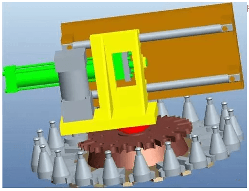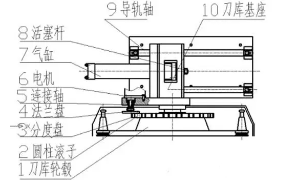 斗笠式自动换刀装置其刀库横移装置采用气压传动,而刀库分度装置则采用槽轮机构来实现。