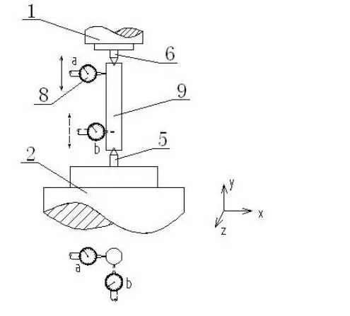 ③将指示器测头在b方向触及检验棒,沿Y轴方向移动磨头主轴,指示器在所述第二检验棒两端位置读数的差值,就是所述数控加工中心639cc全民彩主轴与所述尾架轴回转中心b方向的同心度误差,计为b。