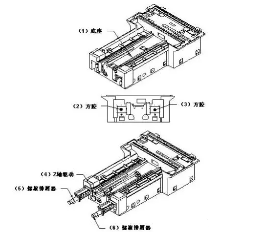 第一种(如图 1)底座结构 :在底座(1)的 Z 轴驱动(4)两侧,开 2 个贯穿整个底座的方 腔(2)(3),将螺旋排屑器(5)(6)置于方腔中,这一结构,落屑和排屑空间小,切削热在狭 窄的排屑通道内,通过各金属件向底座传导,且不利于超大流量冷却的切削液回流。