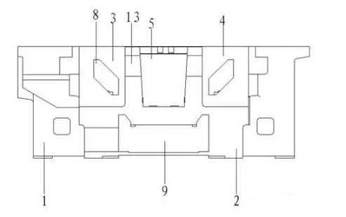 第二种(如图2)底座结构:在底座(1)后部的加工侧,设置一个半截大空腔(2),将加宽的链板排屑器(5)置于空腔(2)内。在底座(1)前部的非加工侧,采用2个螺旋排屑器(3)(4),将非加工侧飞溅的零星切屑导入链板排屑器(5),这一结构,相比第一种结构,提升 了机床排屑能力,实现了加工侧切屑和切削液的迅速排除底座,但是,其多个排屑器组合和 底座(1)内部的前后阶梯设计,增加了结构的复杂程度和机床防护设计、制造和后期维护的 难度,非加工侧,飞溅的切屑仍然会将切削热通过排屑器等金属零件向底座传导。