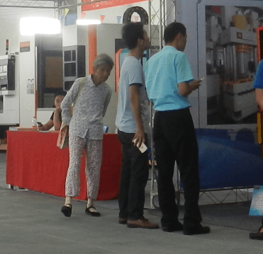 当我抬头看看周边时我发现前面有一个老太太,穿的好像一身睡衣。头发都白了。手里提着一个不知道哪个厂家的宣传包。在各个展位转,也不去展位里面,就在边上看看,还时不时的问参展商要样本宣传册,可是很多参展商都摆手不给,或者直接不理会。(因为每次参加展会,都有一些当地的老人去展会收集样本;拿出去当废品卖掉,这也是避免不了的,再加上这位老太太的穿着打扮,一看就不像客户)