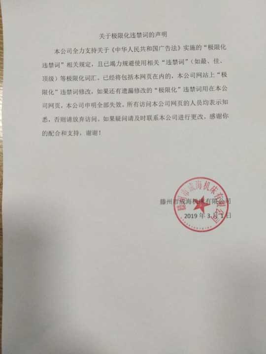 我司全力支持关于《中华人民共和国广告法》实施的“极限化违禁词”相关规定,且已竭力规避使用相关“违禁词”(如最 佳丶顶级)等极限化词汇。我公司已经将网站上所有“极限化”违禁词修改或删除,如果还有遗漏修改的“极限化”违禁词用在我司网站上,我司申明全部失效。所有访问成海公司官方网站的人员均表示知悉,否则请放弃访问。同时不支持任何发来“违禁词”为借口或理由投诉我公司 违反《中华人民共和国广告法》或《新广告法》来变相勒索索要赔偿的违法恶意行为!