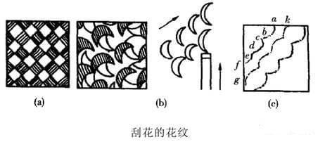 4、刮花阶段:目的是使铸铁平台的刮研平面美观,并在滑动工件之间造成良好的滑动条件。常见的花纹有斜纹花、鱼鳞花和半月花,如下图所示。铸铁平台常见的是斜纹花。