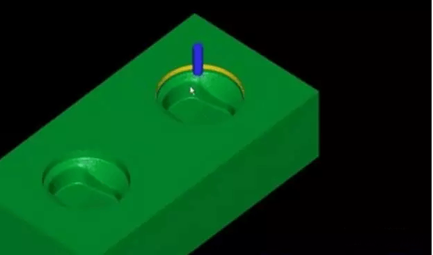 适合中间有大孔的情况(少用)。注意事项:弹刀,刀不锋利,刀过长,工件过深时要环绕走不可上下走;工件中的利角两边的面要分两个刀路,不可越过去,光刀时的边缘最好延长(用弧线进退刀)。
